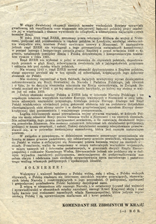 Rozkaz Dowódcy Armii Krajowej nr 126 z 12 stycznia 1944 r. zapowiadający otwarte wystąpienie zbrojne we współpracy z Sowietami przeciwko Niemcom, ale piętnujący dotychczasowe antypolskie działania sowieckie i rozbudowę armii Zygmunta Berlinga, ze zb. Marka Ney-Krwawicza