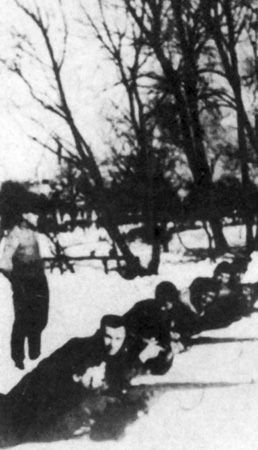 Ćwiczenia kompanii łączności 27. WDP AK, Stoi drużynowy NN „Pokrzyka”, leżą od lewej – Antoni Stępkowski „Halicz” (pierwszy), NN „Maleńki” (czwarty), Mieczysław Suszczewski „King” (ostatni), Ossa, marzec 1944 r. AK, ze zb. Światowego Związku Żołnierzy Armii Krajowej Okręg Wołyń