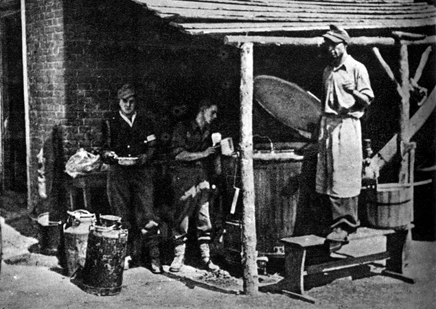 Kuchnia polowa pod naprędce zbudowanym dla niej daszkiem,