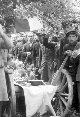 Niemniej ważne było zaopatrzenie, od prawej „Tomek”, „Kruk”, dwaj NN, „Zagłoba”, „Julisław”, „Narpol”, „Waloński”, ze zb. Światowego Związku Żołnierzy Armii Krajowej Okręg Polesie