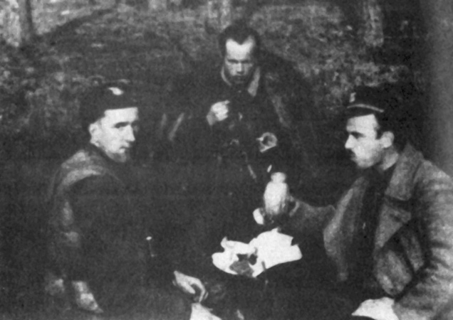 Na biwaku, od prawej siedzą por. Zygmunt Szendzielarz „Łupaszka”, ppor Longin Wojciechowski „Ronin”