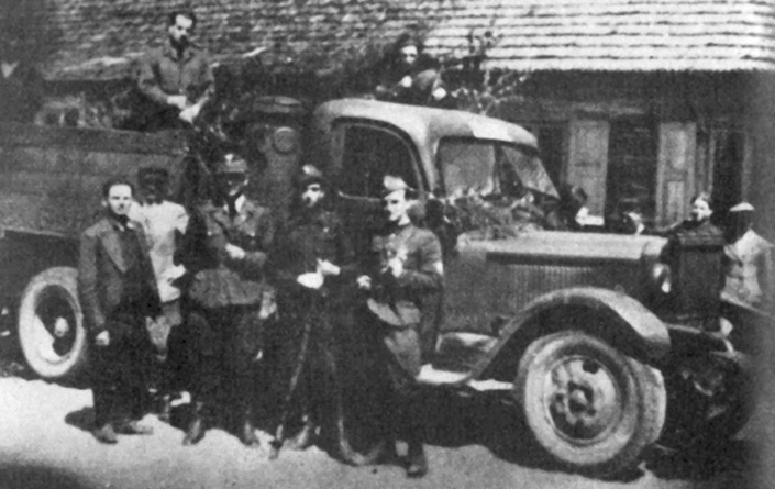 Pierwszy zdobyczny „Holzgas” 1. Brygady Wileńskiej, Bujwidze. Przed samochodem (na dachu szoferki wystawiony rkm) stoją „Jurandowcy”, od prawej: pchor. Sławomir Słubicki „Prus” (z widoczną na lewym ramieniu naszywką UBK i „pepeszą”), kpr. Henryk Dzieciątko „Kruk” (łącznik i obserwator por. „Ptasznika”