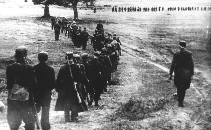 Oddziały 5. Brygady Wileńskiej maszerujące wężem przez pola; |
