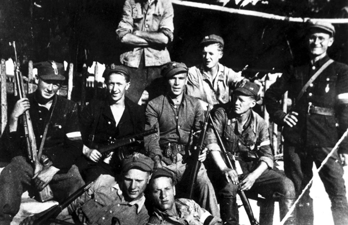 Żołnierze 7. Brygady, siedzą od lewej: Edward Lasmanowicz, Henryk Dziekiewicz, NN, Leon Lisatowicz, Kazimierz Kozakiewicz, leżą od lewej NN i Antoni Minkowski, Jurgielany, czerwiec 1944,