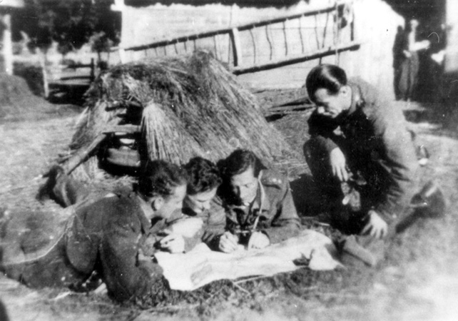 Oficerowie oddziału leśnego 6. kompanii 26. pp, nad mapą ppor. Tadeusz Guzik „Uzda” i por. Walerian Proszowski „Józef”, ze zbiorów Światowego Związku Żołnierzy Armii Krajowej Obszar Lwów