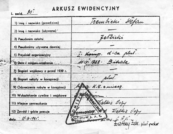 Arkusz ewidencyjny nr 35 Stefana Trembickiego z 15 października 1945 r. z Komisji Likwidacyjnej do spraw byłej Armii Krajowej, ze zbiorów Światowego Związku Żołnierzy Armii Krajowej Obszar Lwów