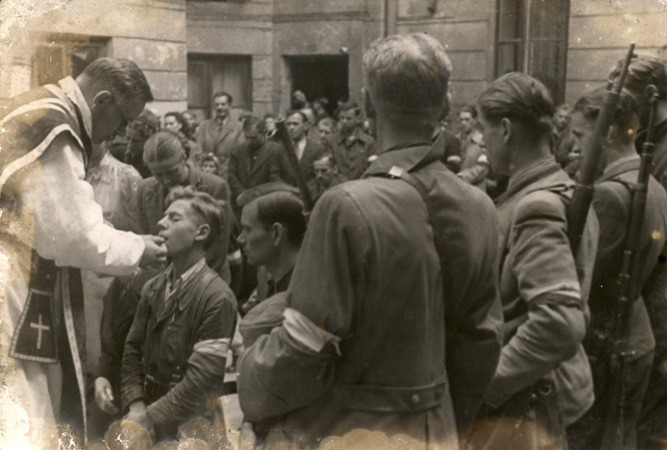 Komunia święta w czasie mszy polowej na jednym z warszawskich podwórek, ze zb. Marka Ney-Krwawicza