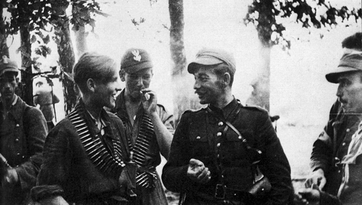 Por. Jerzy Sztajgierwald „Rozłóg” w rozmowie z żołnierzami swojej 6. kompanii 2 pp leg. AK w chwilę po przekazaniu rozkazu marszu na Warszawę, 15 sierpnia 1944, fot. Jan Jakóbiec, J. Jakóbiec, R. Wójcikowski, My Armii Krajowej Żołnierze, Warszawa 1992