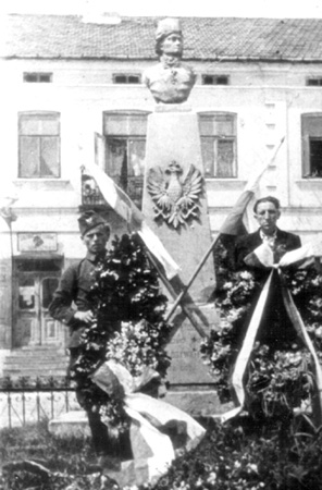 Warta honorowa przed wyciągniętym z ukrycia pomnikiem Tadeusza Kościuszki, Daleszyce, lipiec-sierpień, ze zb. Stanisława Piwowarskiego