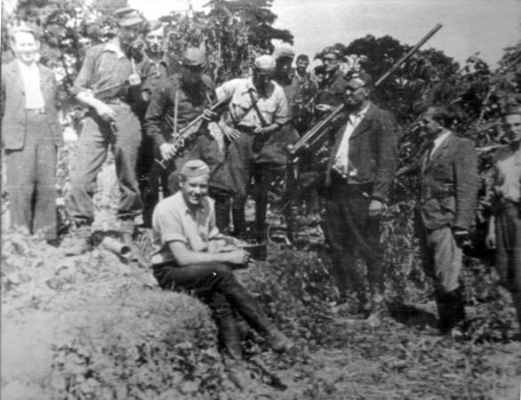 Żołnierze z plutonu Juliana Grzędy z częściami wymontowanymi z zestrzelonego Focke-Wulfa 190, Słoniowice, 5 sierpnia 1944, ze zb. Stanisława Piwowarskiego