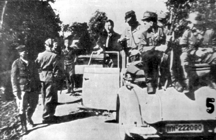 Żołnierze AK jadący zdobycznym samochodem pod Jaksice z pomocą walczącemu z Niemcami oddziałowi Juliana Słupika „Boruta 22”, 5 sierpnia 1944, ze zb. Stanisława Piwowarskiego