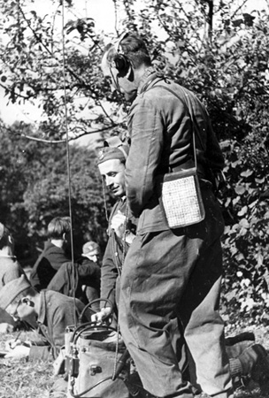 Komendant „Kościesza” rozmawia przez radio z jednym z dowódców oddziałów partyzanckich; klęczy por. Kazimierz Sobolewski „Vis”; notuje Bohdan Radcowski „Świerk”; z tyłu widać głowę Tadeusza Ząbczyka „Zapolsza”, z kolekcji Zofii Horodyńskiej w zbiorach Muzeum Regionalnego „Dom Grecki” w Myślenicach