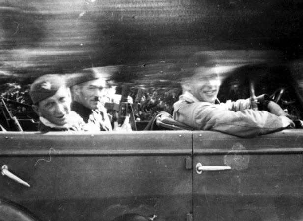 W sześciokołowej skodzie; od lewej: ppor. Wincenty Horodyński „Kościesza”, por. Antoni Węgrzyn „Ostroga”, pchor. Zbigniew Banach „Buk”. Prawdopodobnie jest to wyjazd do Drogini na rozmowy