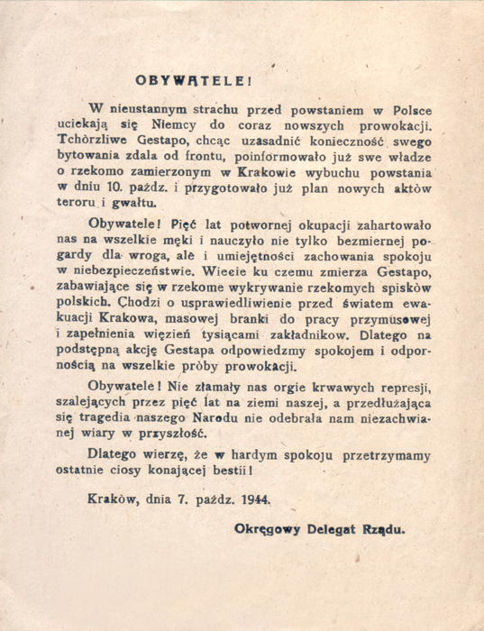 Ulotka Komendanta Okręgu Kraków AK ostrzegająca mieszkańców miasta przed próbą sprowokowanego przez gestapo wybuchu powstania, ze zbiorów Muzeum Historycznego Miasta Krakowa