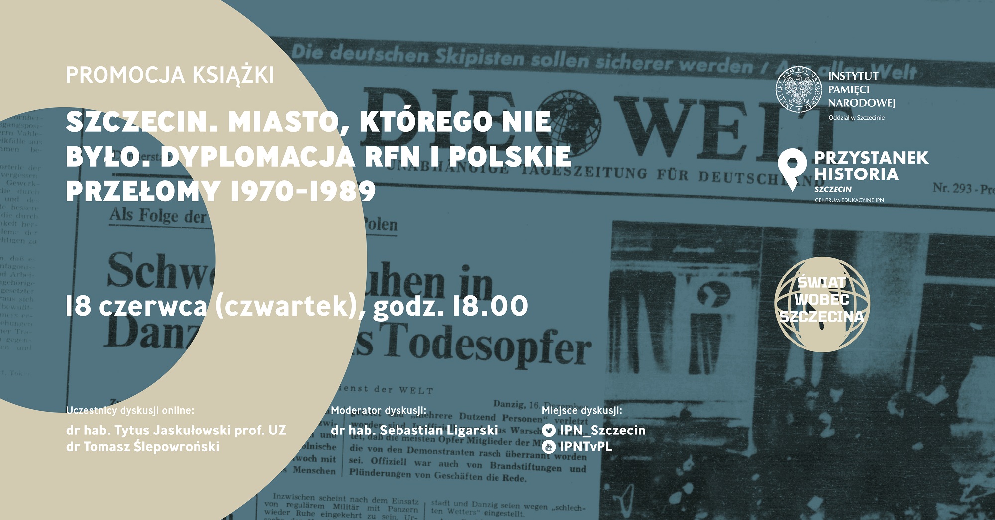 Zapraszamy do obejrzenia zapisu dyskusji wokół najnowszej książki dr. hab. Tytusa Jaskułowskiego, prof. Uniwersytetu Zielonogórskiego, „Szczecin. Miasto, którego nie było. Dyplomacja RFN i polskie przełomy 1970–1989”.