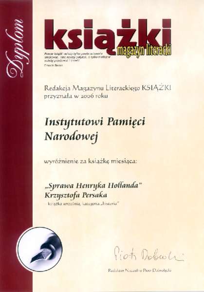 W dniu 25 stycznia 2007 r. w Bibliotece Narodowej w Warszawie odbyła się uroczystość wręczenia nagród Książki Miesiąca i Książki Roku, przyznanych przez redakcję „Magazynu Literackiego KSIĄŻKI”. Tytuł książki września 2006 r. w kategorii „historia” otrzymała praca Krzysztofa Persaka „Sprawa Henryka Hollanda”, wydana przez Instytut Pamięci Narodowej i Instytut Studiów Politycznych PAN.