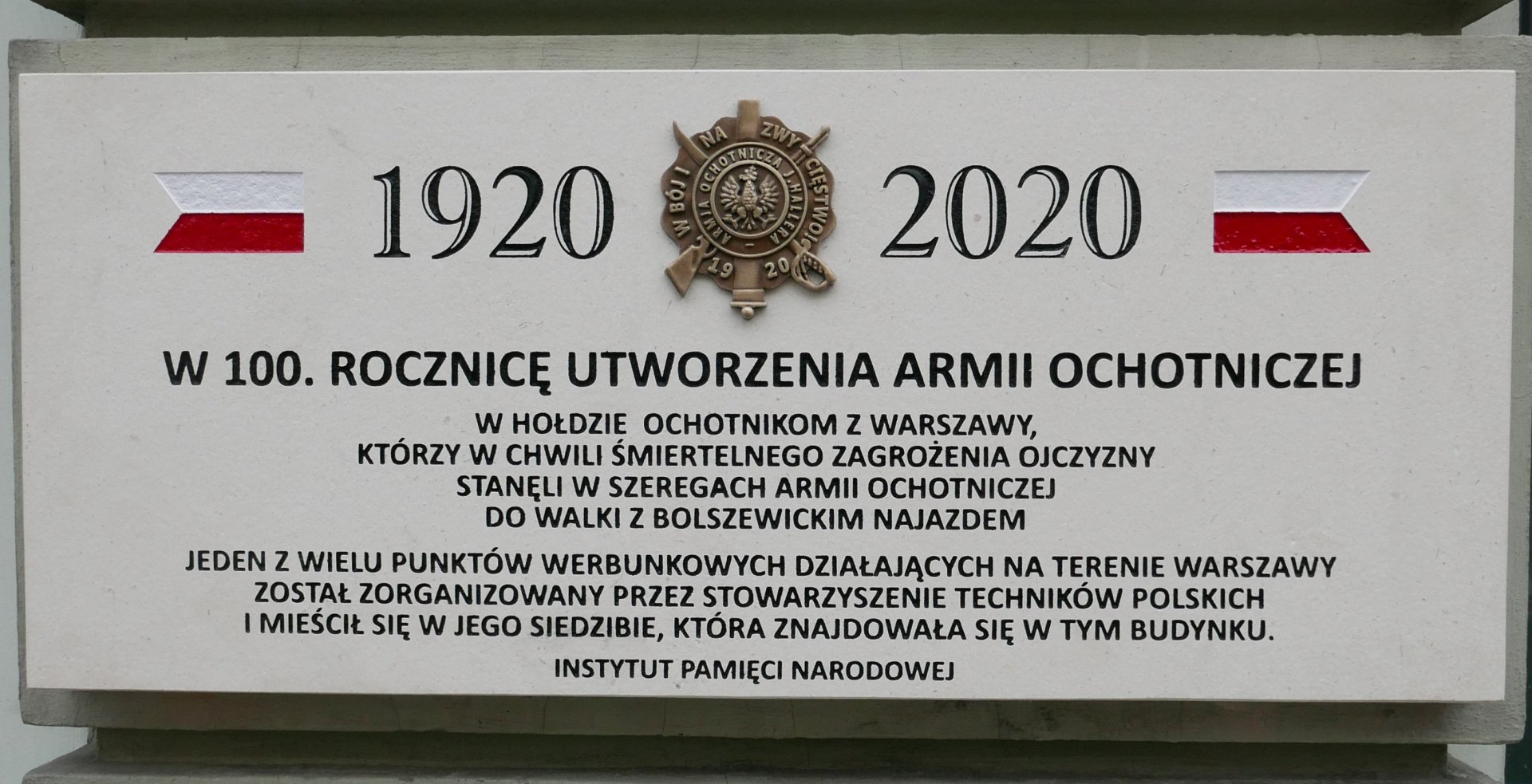 W setną rocznicę zwycięstwa nad bolszewikami w Bitwie Warszawskiej 1920 r. Instytut Pamięci Narodowej upamiętnia to wydarzenie poprzez odsłonięcie tablic poświęconych Armii Ochotniczej 1920 roku w miejscach, w których znajdowały się punkty werbunkowe.