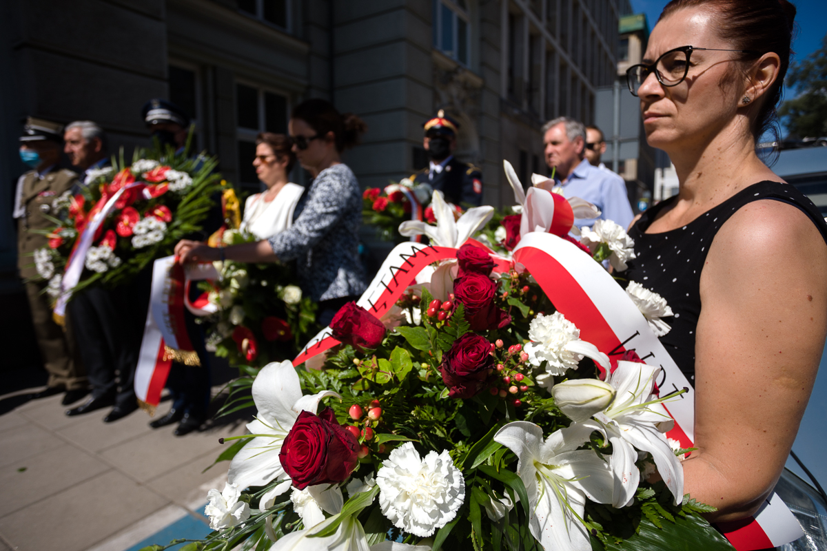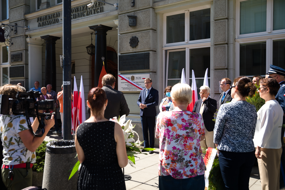 Na zakończenie uroczystości delegacje złożyły wieńce przed nową tablicą na ścianie budynku Warszawskiego Domu Technika.