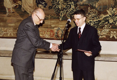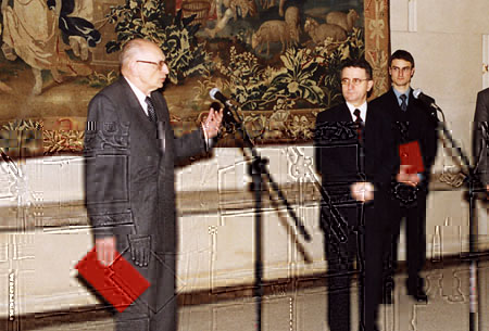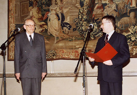 Prof. Władysław Bartoszewski otrzymuje formularz wniosku od prof. Leona Kieresa.
