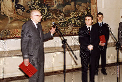 Uroczystość wręczenia prof. W. Bartoszewskiemu pierwszego formularza wniosku o udostępnienie dokumentów zbieranych przez służby specjalne PRL. -