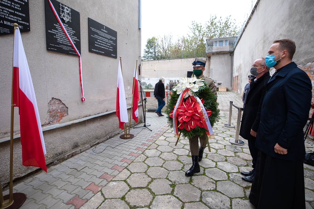 Kwiaty pod tablicą w Muzeum Żołnierzy Wyklętych i Więźniów Politycznych PRL w Warszawie, poświęconą pamięci „Jaworzniaków”, złożył wiceprezes IPN prof. Krzysztof Szwagrzyk – 9 października 2020. Fot. Sławek Kasper (IPN) -