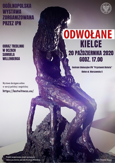 Ze względu na potencjalne zagrożenie zakażeniem SARS-CoV-2 odwołujemy zaplanowany na 20 października 2020 r. wernisaż wystawy rzeźb „Obraz Treblinki w oczach Samuela Willenberga”, który miał się odbyć w Centrum Edukacyjnym „Przystanek Historia” IPN w Kielcach, ul. Warszawska 5.