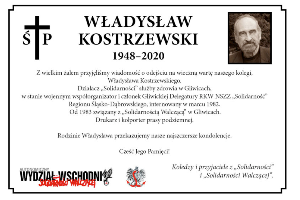 18 października 2020 r. zmarł Władysław Kostrzewski. W 1980 r. zaangażował się w działania NSZZ „Solidarność” w Zakładzie Opieki Zdrowotnej w Gliwicach, z czasem zostając jej przewodniczącym. Przeszedł do historii jako współtwórca struktur gliwickiej opozycji w stanie wojennym. W latach 1983–1989 był współpracownikiem Solidarności Walczącej. Wierny ideałom Solidarności, całą swoją aktywność poświęcał walce o wcielenie ich w życie.