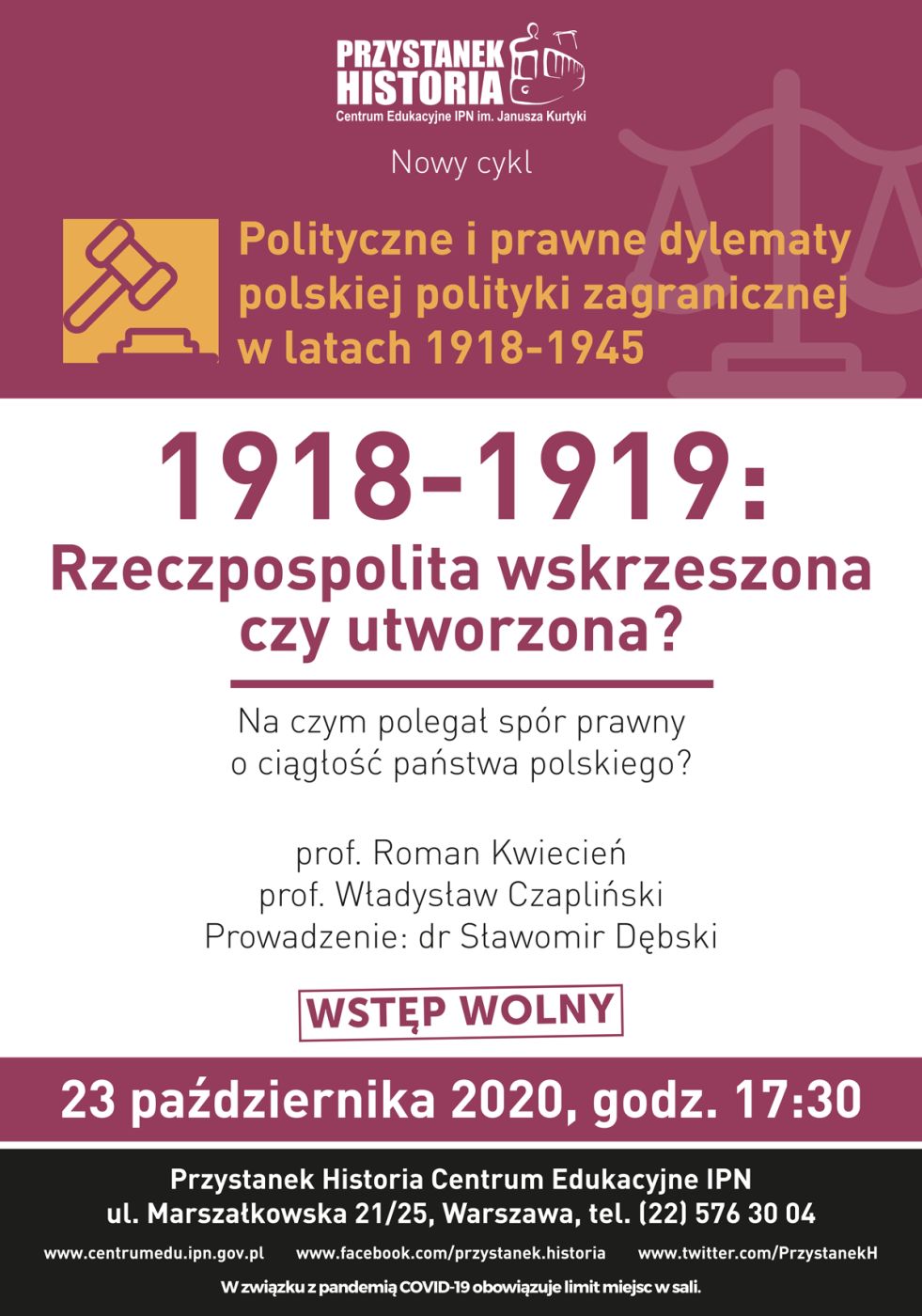 Cykl poświęcony jest kluczowym zagadnieniom polskiej polityki zagranicznej w latach 1918–1945 w kontekście zmian systemowych w polityce wielkich mocarstw i sytuacji politycznej w Europie. Zaczniemy od dyskusji o międzynarodowych aspektach prawnego uznania odrodzonej państwowości polskiej, problemu prawnych związków odrodzonej Polski z Rzeczpospolitą przedrozbiorową i znaczenia tych kwestii dla polskiej dyplomatycznej batalii na konferencji pokojowej w Paryżu. Cykl zakończymy dyskusją wokół problemu prawnego statusu Polski Ludowej po 7 lipca 1945, czyli cofnięcia przez mocarstwa uznania dla rządu londyńskiego. Dyskusje prowadzi dr Sławomir Dębski – historyk, politolog ekspert ds. międzynarodowych.