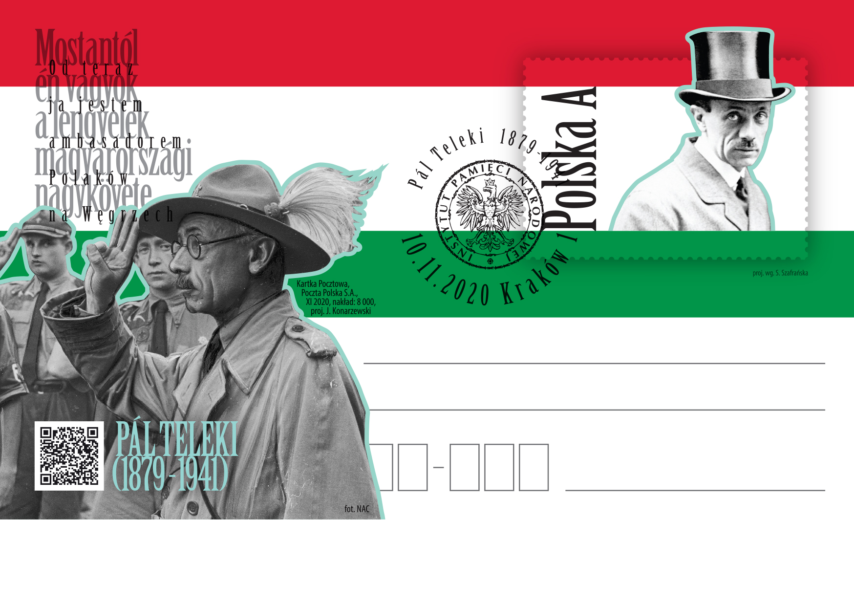 Na kartce pocztowej umieszczony jest kod QR, po którego zeskanowaniu Klienci mogą zapoznać się z notą biograficzną Pála Telekiego oraz opisem książki Balázsa Ablonczyego, Pál Teleki (1879–1941) wydanej przez IPN we współpracy z Węgierskim Instytutem Kultury oraz Fundacją im. Wacława Felczaka w Budapeszcie.