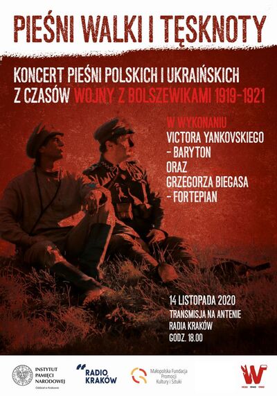 Oddział IPN w Krakowie zaprasza na koncert pieśni polskich i ukraińskich z czasów wojny polsko-bolszewickiej 1919-1921, w wykonaniu solisty Opery Lwowskiej Wiktora Jankowskiego (baryton) z towarzyszeniem Grzegorza Biegasa (fortepian), profesora Katedry Kameralistyki Akademii Muzycznej im. Karola Szymanowskiego w Katowicach.