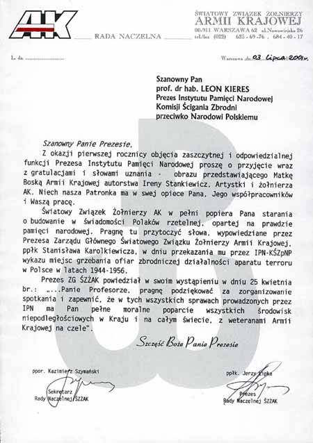 W dniu 3 lipca b.r. o godzinie 15.00 w siedzibie Instytutu Pamięci Narodowej Prezes, prof. Leon Kieres, przyjął Prezesa Rady Naczelnej Światowego Związku Żołnierzy Armii Krajowej ppłk. Jerzego Lipkę, Sekretarza Rady i Prezesa Stowarzyszenia "Szare Szeregi" Kazimierza Szymańskiego, Prezesa Stowarzyszenia Polskich Kombatantów w Kraju Władysława Matkowskiego oraz Irenę Stankiewicz, żołnierza AK i artystkę plastyka.