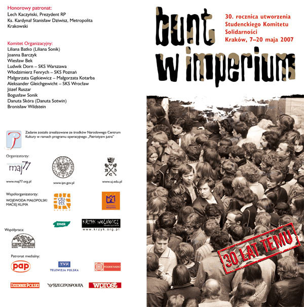Od 7 do 20 maja 2007 r. odbywały się w Krakowie obchody 30. rocznicy utworzenia Studenckiego Komitetu Solidarności – niezależnej organizacji studenckiej, powołanej 15 maja 1977 r. przez grupę studentów z Krakowa po tragicznej śmierci ich kolegi, studenta polonistyki i filozofii Stanisława Pyjasa, zamordowanego przez bezpiekę. Współorganizatorem uroczystości był Instytut Pamięci Narodowej.