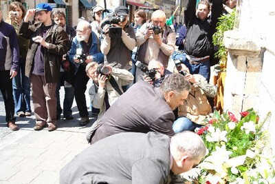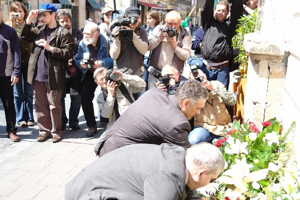 Po uroczystości otwarcia wystawy organizatorzy obchodów złożyli kwiaty pod tablicą pamiątkową w miejscu zamordowania Stanisława Pyjasa, przy ul. Szewskiej 7.