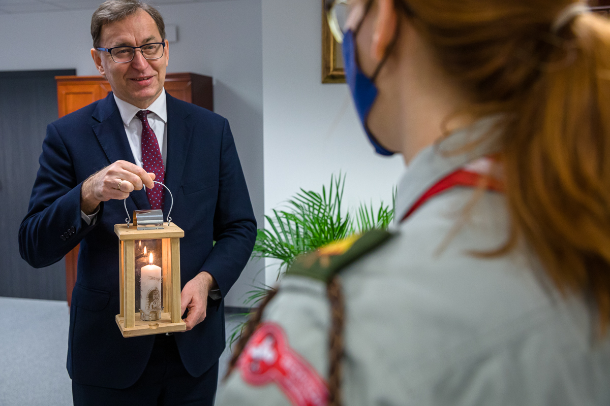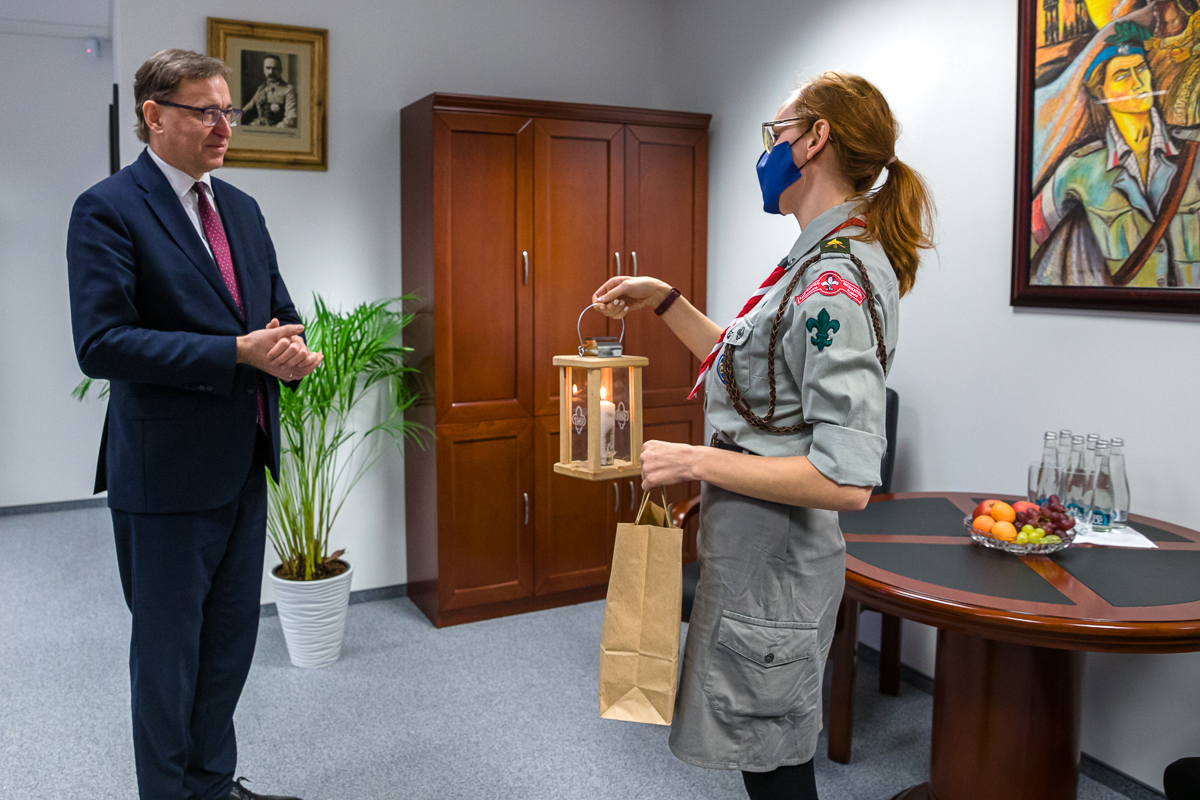 13 grudnia 2020 Betlejemskie Światło Pokoju dotarło do Polski, a już 14 grudnia zapłonęło w siedzibie Instytutu Pamięci Narodowej w Warszawie. Prezes IPN, dr Jarosław Szarek, przyjął je z rąk delegacji harcerskiej i złożył wszystkim serdeczne życzenia.