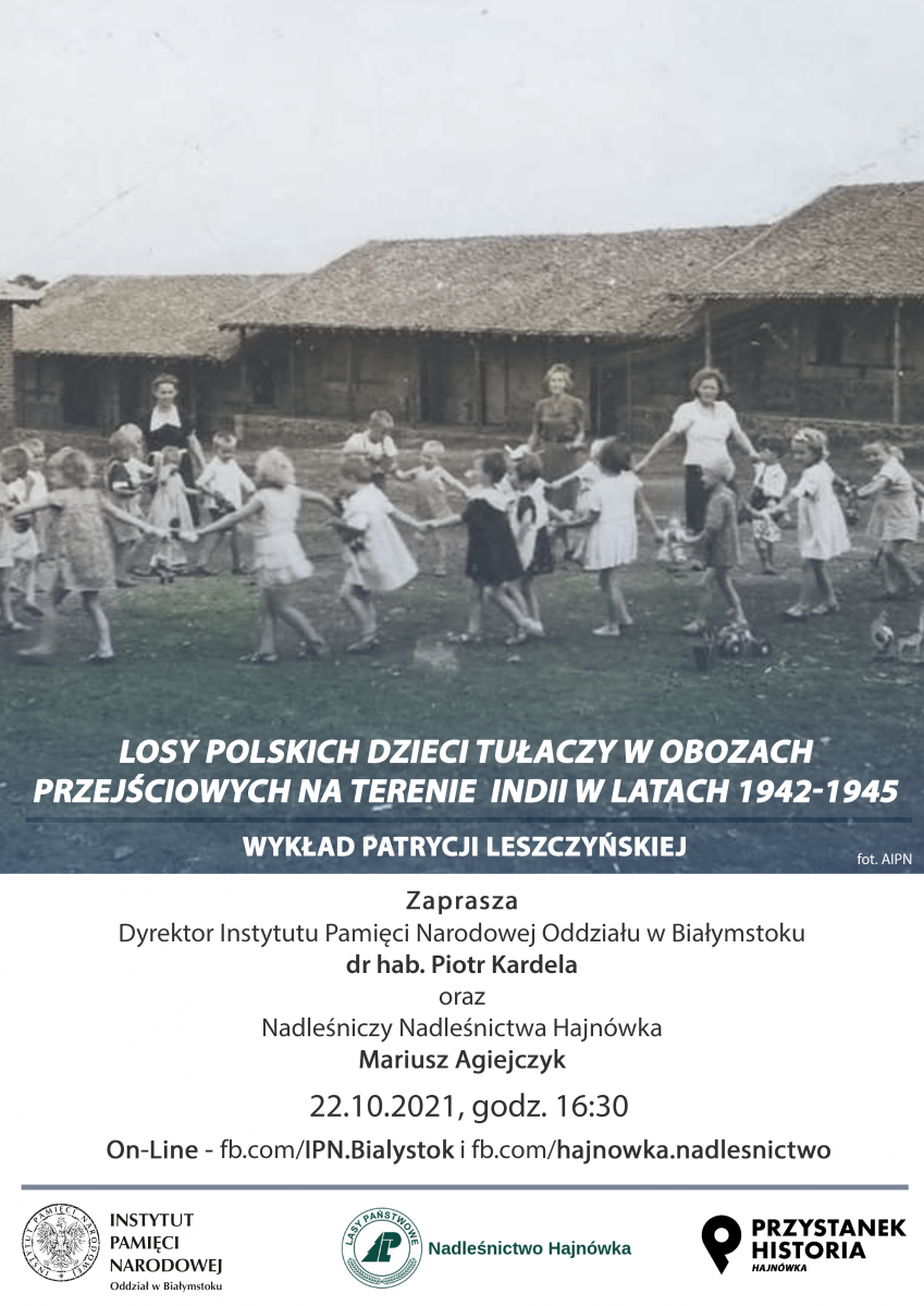Zapraszamy na Przystanek Historia Hajnówka. Z powodu panującej pandemii COVID-19 wydarzenie odbędzie się online na Facebooku Oddziału Instytutu Pamięci Narodowej w Białymstoku i Nadleśnictwa Hajnówka 22 stycznia o godz. 16:30. Wykład pt. „Losy polskich dzieci tułaczy w obozach przejściowych na terenie Indii w latach 1942–1945” wygłosi Patrycja Leszczyńska – pracownik Biura Edukacji Narodowej IPN w Białymstoku.