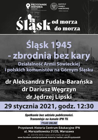 „Przystanek Historia” – Centrum Edukacyjne IPN im. Janusza Kurtyki w Warszawie zaprasza na dyskusję online „Śląsk 1945 – zbrodnia bez kary. Działalność Armii Sowieckiej i polskich komunistów na Górnym Śląsku” z cyklu „Śląsk od morza do morza”.