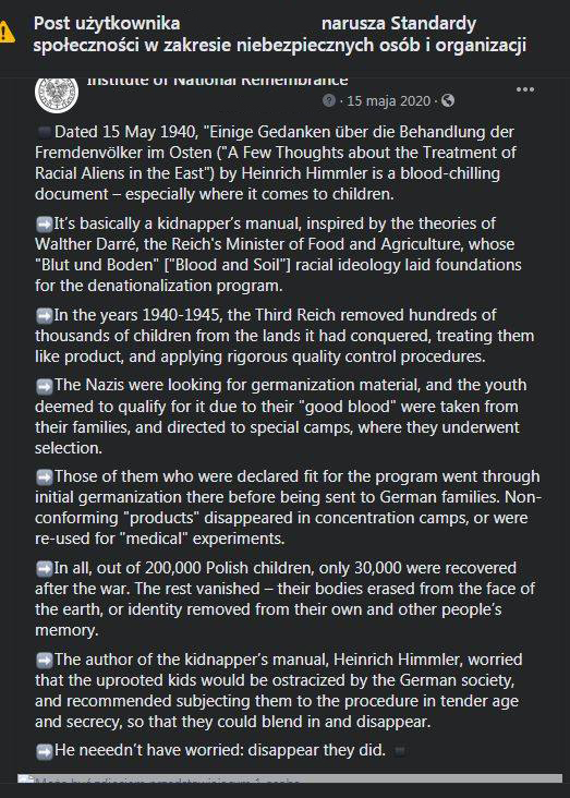 W poście, który został zablokowany, napisaliśmy o niemieckich planach germanizacji dzieci , odnosząc się do autentycznych dokumentów. Mimo zgłoszenia o zweryfikowanie decyzji, konto jest zablokowane od sobotniego przedpołudnia.