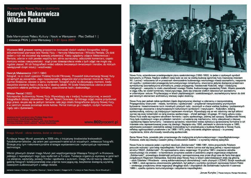 7 lipca 2007 r. w Sali Marmurowej Pałacu Kultury i Nauki w Warszawie otwarto przygotowaną przez Fundację Imago Mundi wystawę „802 procent normy”. Na zdjęciach autorstwa wybitnych fotografów Henryka Makarewicza i Wiktora Pentala można obejrzeć pierwsze lata Nowej Huty – jednego z czołowych symboli komunizmu w Polsce. Uwieczniona została nie tylko budowa kombinatu im. Lenina, lecz także różne aspekty życia w wybudowanej od podstaw dzielnicy przemysłowej Krakowa. Patronat honorowy nad wystawą objął Instytut Pamięci Narodowej. Ekspozycja będzie czynna do 30 lipca w godz. 10:00–19:00.