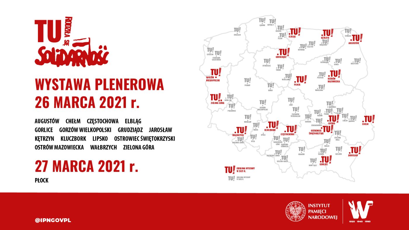 26 marca 2021 roku, w 16 miastach w Polsce, rozpoczęła się druga odsłona wystawy „TU rodziła się »Solidarność«”. W kolejnych miesiącach zaprezentujemy ekspozycję w następnych miejscowościach. W 2020 roku wystawa eksponowana była w 58 miastach.