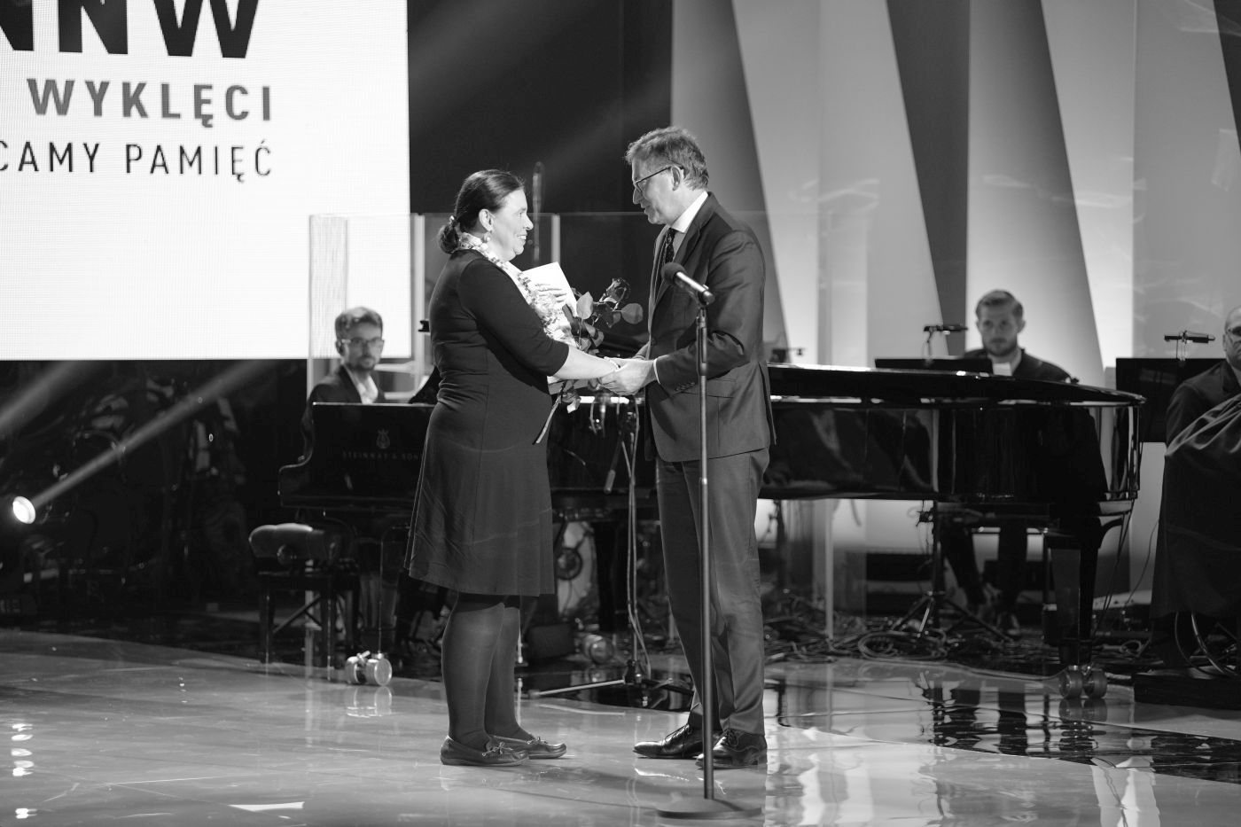 Dr Anca-Maria Cernea odbiera z rąk prezesa IPN dr. Jarosława Szarka nagrodę „Drzwi do wolności” przyznaną jej rodzicom Elsie Ance-Barbus oraz Ioanowi Barbusowi