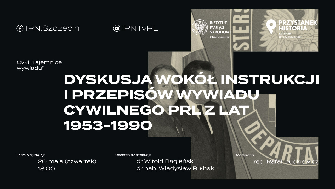 20.05. o 18.00 zapraszamy na nasz fanpage'u @IPN.Szczecin na Facebooku oraz YouTube IPNtvPL na dyskusję online w ramach cyklu „Tajemnice Wywiadu”, wokół książki wydanej przez Instytut Pamięci Narodowej, pod red. nauk. Witolda Bagieńskiego: „Instrukcje i przepisy wywiadu cywilnego PRL z lat 1953–1990”. Gośćmi red. Rafała Dudkiewicza – stałego prowadzącego szczeciński cykl „Tajemnice Wywiadu”, będą dr Władysław Bułhak z Biura Badań Historycznych IPN oraz dr Witold Bagieński z Wydziału Badań Archiwalnych i Edycji Źródeł Archiwum IPN.