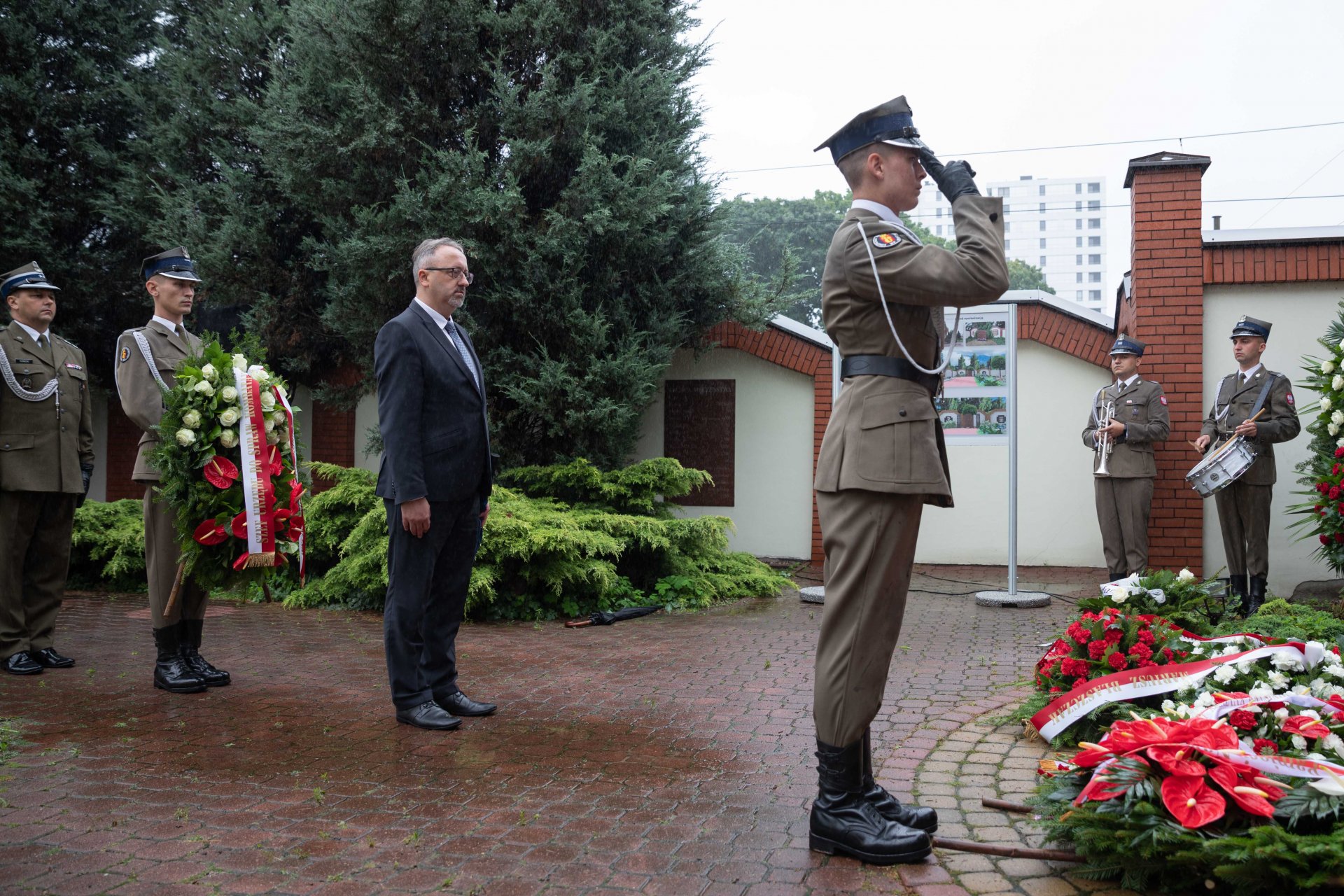 Dr hab. Karol Polejowski, zastępca prezesa IPN, składa kwiaty przed tablicą upamiętniającą ofiary rzezi Woli. Fot. Mikołaj Bujak -