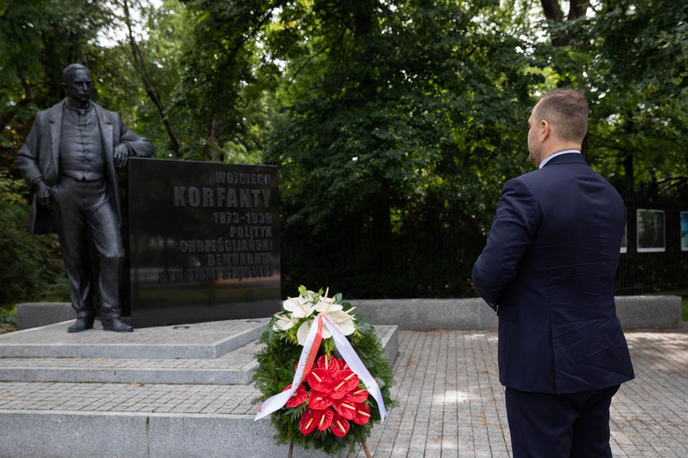 Wojciech Korfanty (ur. 1873) zmarł w Katowicach 17 sierpnia 1939 roku. Był najważniejszym przedstawicielem polskiego ruchu narodowego z Górnego Śląska. Przeciwstawiał się germanizacyjnej polityce władz niemieckich wobec ludności polskiej, walczył o polepszenie sytuacji niższych warstw społecznych. Występował na forum parlamentarnym i na wiecach, był czynny jako dziennikarz i wydawca prasowy, stworzył gazety „Polak” i „Górnoślązak”. W listopadzie 1918 r. został członkiem Naczelnej Rady Ludowej w Poznaniu, kierował jej wydziałem wojskowym w czasie powstania wielkopolskiego. Gdy w traktacie wersalskim zapisano, że los Górnego Śląska ma zostać rozstrzygnięty w plebiscycie, stanął na czele Polskiego Komisariatu Plebiscytowego i kierował jego akcją propagandową. W maju 1921 r. wywołał III powstanie śląskie i został jego dyktatorem, odnosząc sukcesy militarne i polityczne. W efekcie powstania 1/3 obszaru plebiscytowego została przyznana Polsce. Wskutek oporu Józefa Piłsudskiego nie objął stanowiska premiera, pozostał jednak wiodącym politykiem w województwie śląskim. Był jednym z twórców i liderów polskiej chadecji, wydawcą i publicystą dziennika „Polonia”. Po zamachu majowym 1926 r. przeciwstawił się sanacji, za co spotkały go szykany, m.in. uwięzienie w Brześciu. W 1938 r. wyemigrował do Czechosłowacji. Powrócił do Polski w kwietniu 1939 r. i został aresztowany. Zmarł tuż po zwolnieniu z więzienia. Na Górnym Śląsku już za życia był legendą.
