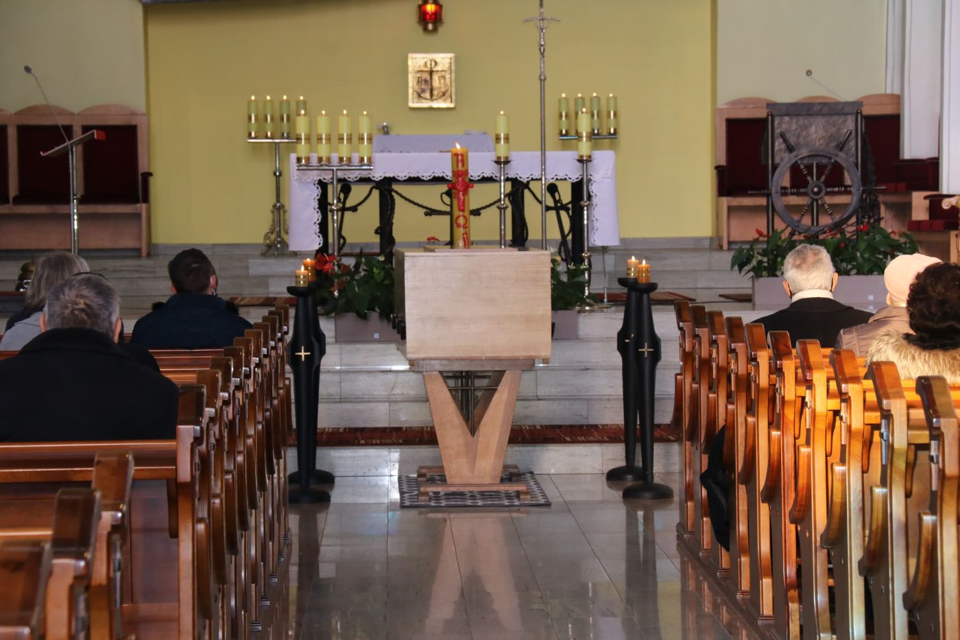 Msza pogrzebowa w intencji śp. kmdr. Adama Stanisława Rychla, mata Karola Martyńskiego i st. mar. Henryka Zająca w Kościele Garnizonowym MW pw. Matki Boskiej Częstochowskiej w Gdyni Oksywiu – 24 listopada 2021. Fot. IPN