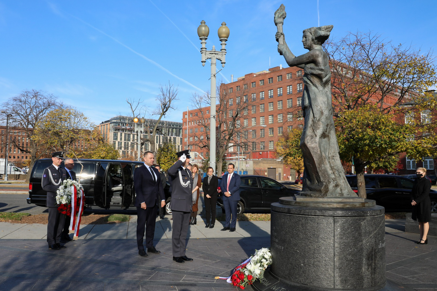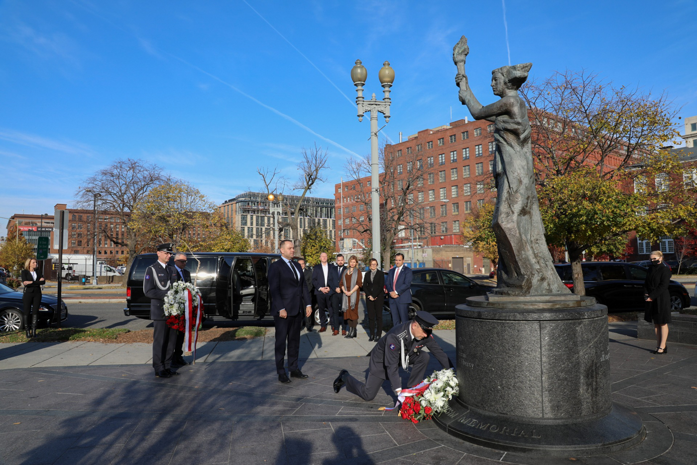 Po spotkaniu prezes IPN wraz z ambasadorem Markiem Magierowskim złożyli wieniec pod pomnikiem Pamięci Ofiar Komunizmu. Towarzyszyła im asysta wojskowa – ppłk Karol Budniak i st. chor. szt. Marek Wszoła. Wzniesiony staraniem Fundacji monument z brązu jest kopią słynnego, wykonanego z papier-mache posągu „Bogini wolności”, ustawionego podczas protestów studentów chińskich na placu Niebiańskiego Spokoju w Pekinie w roku 1989. Odsłonięcia pomnika dokonał prezydent George W. Bush w 2007 roku.