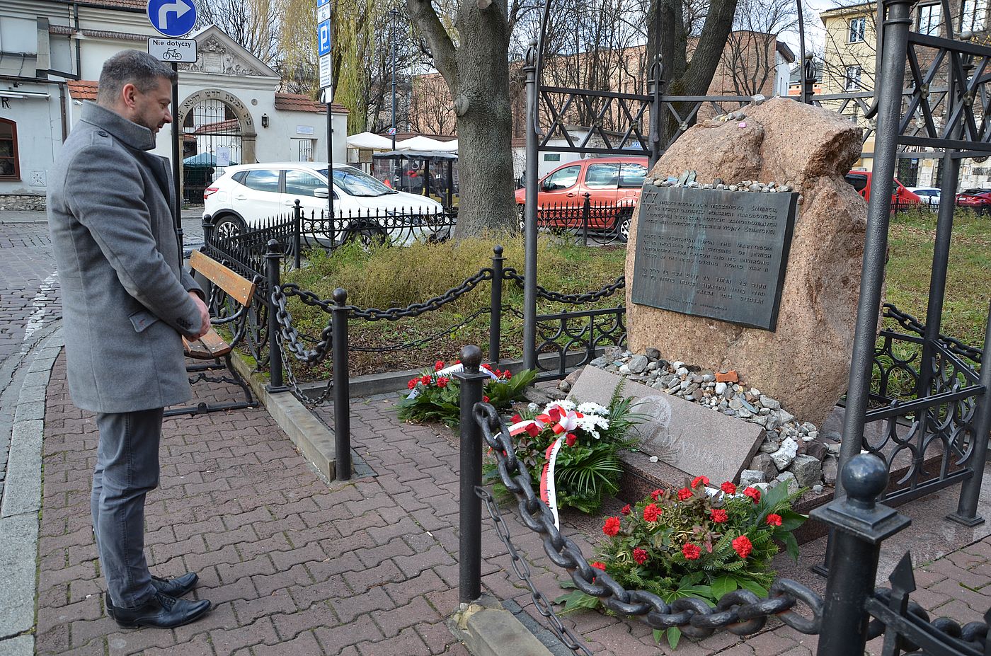 Dyrektor Oddziału IPN w Krakowie dr hab. Filip Musiał złożył kwiaty pod tablicą upamiętniającą siedzibę Rady Pomocy Żydom „Żegota” przy ul. Jagiellońskiej 11 oraz na ul. Szerokiej, pod głazem pamięci 65 tys. krakowskich Żydów – ofiar Holokaustu, zamordowanych przez Niemców podczas II wojny światowej.
