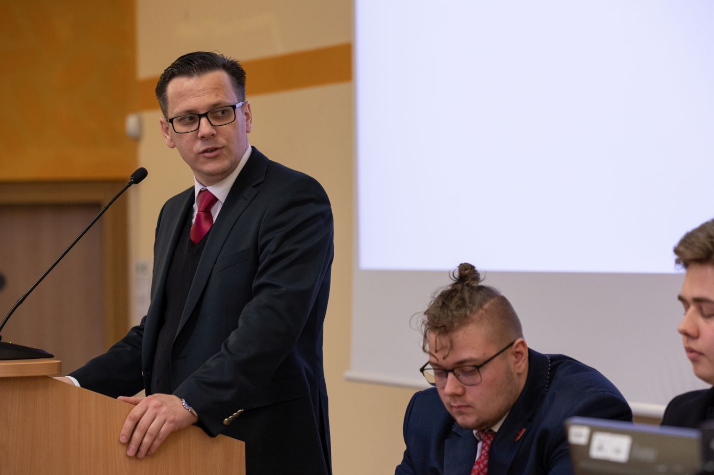 Prezes IPN dr Karol Nawrocki podczas debaty historycznej licealistów „Polscy żołnierze po zakończeniu II wojny światowej posiadali moralny obowiązek kontynuowania walki” – Gdańsk, 4 marca 2022. Fot. Mikołaj Bujak (IPN)