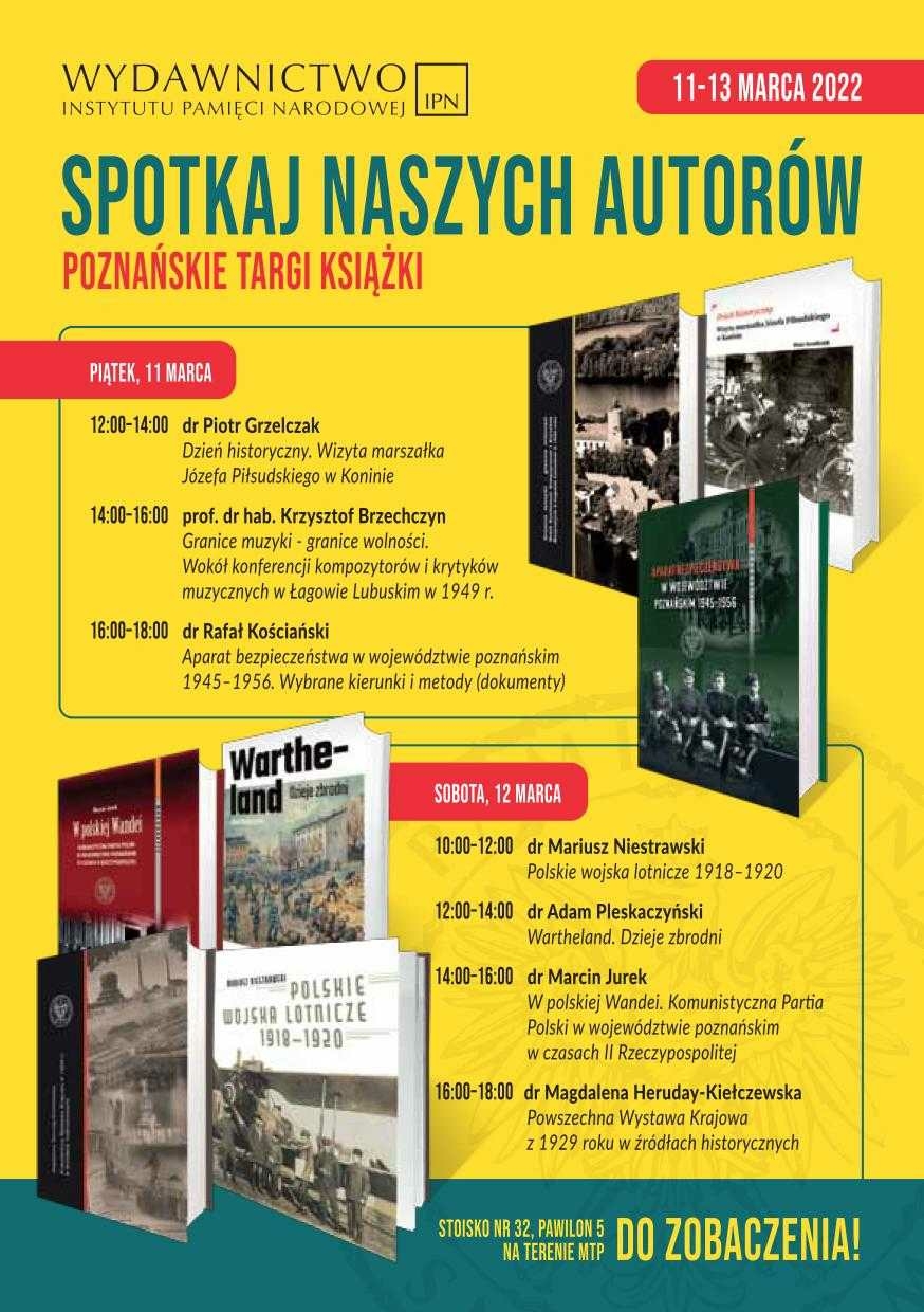 W dniach 11–13 marca 2022 Wydawnictwo IPN wzięło udział w Poznańskich Targach Książki. Na odwiedzających targi czekała bogata oferta wydawnicza w atrakcyjnych cenach. Nowości, bestsellery, albumy, periodyki, komiksy, gry edukacyjne i puzzle. Odbyły się także spotkania z autorami naszych publikacji oraz przedpremierowy pokaz najnowszej edukacyjnej gry planszowej IPN „Powstanie Wielkopolskie 1918–1919”.