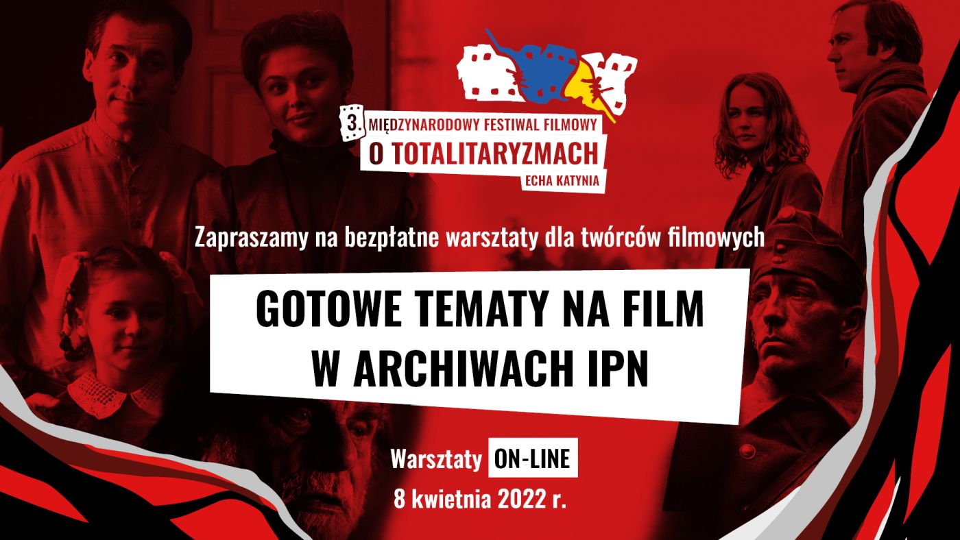 Instytut Pamięci Narodowej zaprasza na bezpłatny warsztat w formie masterclass zatytułowany: Gotowe tematy na film w archiwach IPN. Warsztat, który będzie jednym z wydarzeń towarzyszących III edycji Międzynarodowego Festiwalu Filmowego „Echa Katynia” skierowany jest do profesjonalnych twórców filmowych, także studentów szkół filmowych, zainteresowanych pracą z archiwaliami i filmami o tematyce historycznej.