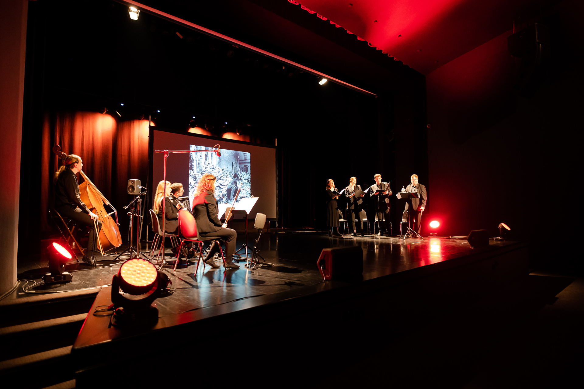 Dramaturgia spektaklu oparta jest na wierszach poetów, takich jak Konstanty Ildefons Gałczyński, Antoni Słonimski, Władysław Broniewski, Marian Hemar, Władysław Szlengel, Jeszajahu Szpigel, Icchak Kacenelson, Loepold Staff, Julian Tuwim. Do wszystkich utworów poetyckich, które pojawiły się podczas widowiska, została napisana muzyka na kwartet wokalny i niewielki zespół instrumentalny w składzie skrzypce, akordeon, klarnet i kontrabas, co stanowi nawiązanie do przedwojennych tradycji muzycznych. Podczas widowiska można było usłyszeć nowo zaaranżowane piosenki oraz specjalnie na tę okazję skomponowaną muzykę. Narrację dopełniał głos lektora, opowiadającego o wydarzeniach z tamtego okresu.